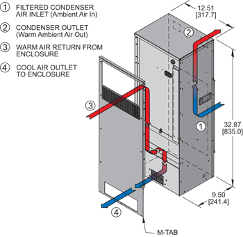 The enclosure interior airflow system is isolated from the ambient airflow or waterflow system. No ambient air can invade the cool, dehumidified sensitive component compartment.