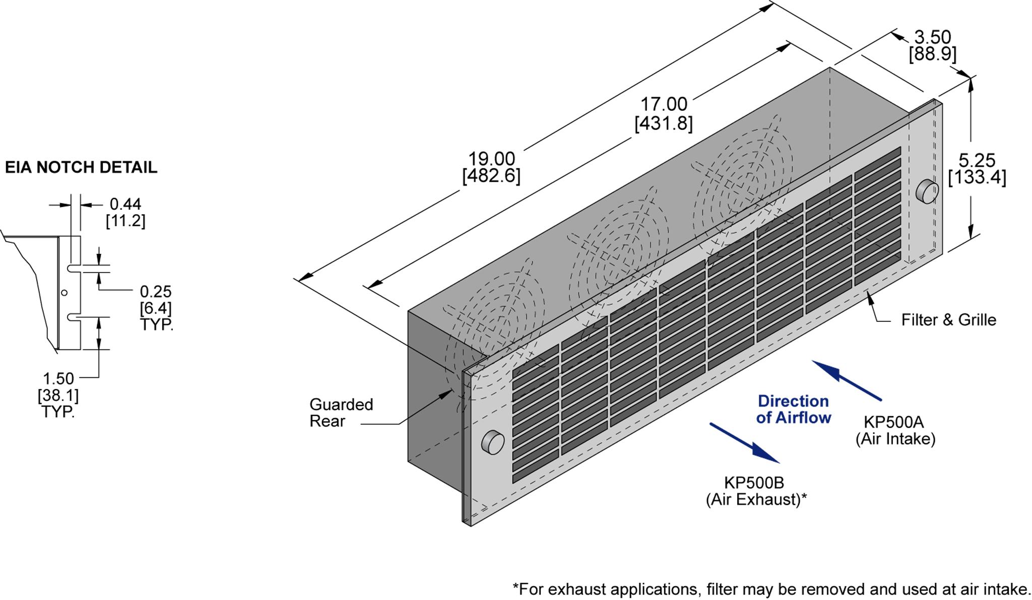 ENCLOSURES: Precision-engineered baked powder coated heavy-gauge steel construction. KP500: 17 inches [431.8mm] panel width. EIA-Notched flanges extend 17-inch [431.8mm] blower enclosure to 19-inch [482.6mm] panel width.