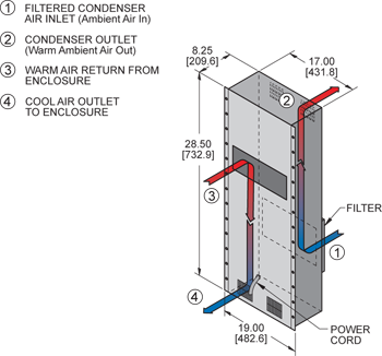 The enclosure interior airflow system is isolated from the ambient airflow or waterflow system. No ambient air can invade the cool, dehumidified sensitive component compartment.